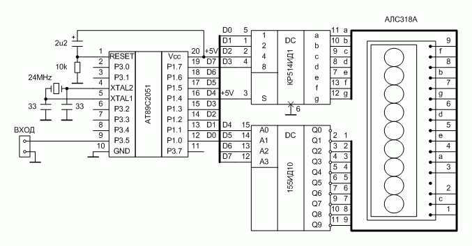 Данный частотомер позволяет измерять частоту от 1Гц до 1МГц. Частотомер собран на МК AT89C2051, работающем на тактовой частоте 24МГц, в качестве индикатора используется АЛС318А с двумя дешифраторами: КР514ИД1 и 155ИД10. Использование указанных дешифраторов позволило максимально упростить программу динамической индикации, а также отказаться в схеме от резисторов и транзисторов. Десятичная точка в данной схеме не используется, группы цифр разделяются неиспользуемым разрядом.