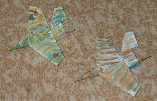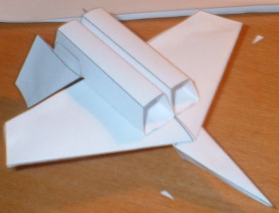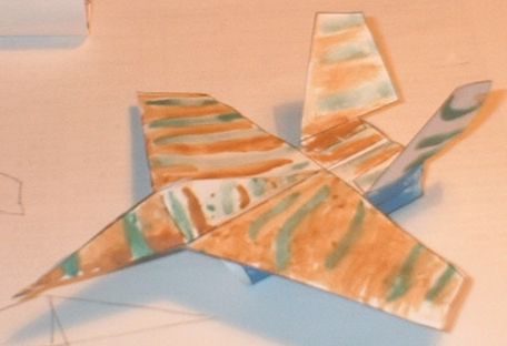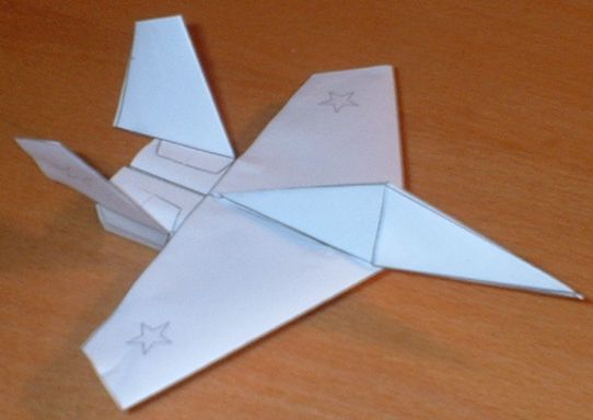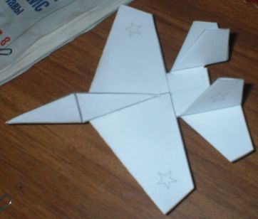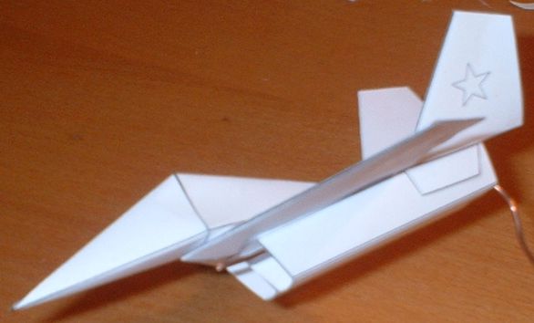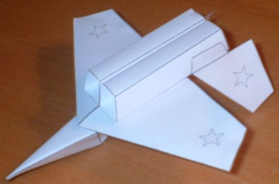Этот самолет вырезается и склеивается примерно за 15 минут. Технология "сборки" проста и ясна из выкройки. Вообще-то он не летает, но заставить можно, если на воздухозаборники спереди надеть 5 скрепок. Порадуйте своего ребенка! :)