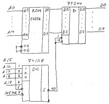 I took an old broken SVGA card with ROM socket. It had no already ROM installed. I have inspected it and found that ROM socket have 15 address lines connected (A0 - A14) - thus it must be 32 KB ROM, eg. 27256. Selection scheme: ROM has permanently grounded both OE and CS pins, thus ROM is always on, ROM outputs are connected to ISA bus through bus driver 74244. Turning bus driver on is used to connect ROM outputs to PC bus. To open bus driver I decided to use 74138 chip and lines A19 - A15 and MEMR signal.