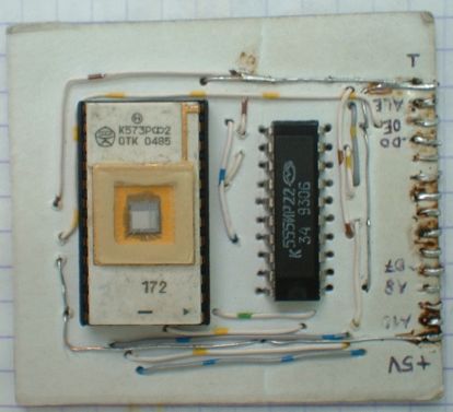 "Оживим" контроллер 8049. Для этого по классической схеме на картонке соберем схему для подключения внешнего ПЗУ с панелькой и регистром-защелкой младших разрядов адреса. Подключим схему к контроллеру, вывод EA у контроллера отрежем от "земли" и резистором 2кОм подключим к +5В.