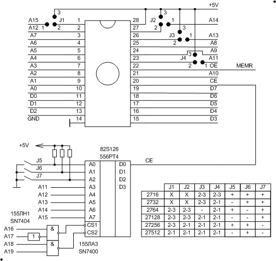 Для экспериментов я собрал плату на базе бывшей сетевой карты с разъемом ISA. Плата задумана как универсальная - для поддержки любых микросхем ПЗУ от 2К до 64К. Это связано с "разномастным" набором ПЗУ у меня, практически все из которых - б/у. Адресное пространство начинается с 0D0000h. Думаю, можно вполне обойтись сетевой картой с разъемом для ПЗУ, однако те, которые я встречал, расчитаны только под 2764. Также можно переделать сетевую карту под конкретный тип ПЗУ, что будет все равно проще, чем делать универсальную плату.