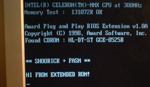 Для использования материнских плат от старых компьютеров желательно иметь программы, записанные в ПЗУ. Однако метод, указанный выше, не очень удобен, так как при замене BIOS целиком нам необходимо самостоятельно выполнять всю инициализацию периферии, которая, к тому же, скорее всего недокументирована. Гораздо надежнее использовать возможности сервиса BIOS ROM extension.
