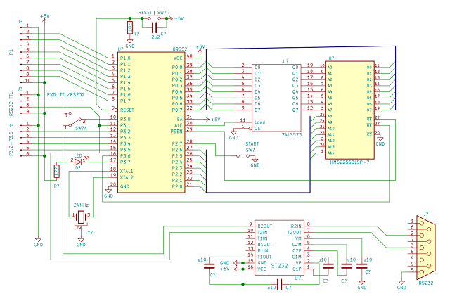 Минималистичная x51 система на базе AT89S51/AT89S52. Позволяет загружать программу с ПК в ОЗУ и затем выполнять ее. Внутренняя память контроллера содержит только начальный загрузчик, поэтому транзитные программы загружаются и выполняются по адресу 2000h, однако все прерывания перенаправлены в эту же область, поэтому доступны для использования. Для загрузки используется интерфейс RS232, также работоспособный с USB через обычные переходники COM-USB для компьютеров, не имеющих аппаратного COM порта. Система может использоваться как для аппаратной отладки программ, так и как многофункциональное периферийное устройство для разовых задач. Диалог с системой можно вести как через устройства, подключаемые к его портам, так и через последовательный порт, для чего написан упрощенный монитор. Поскольку порты 0 и 2 заняты обслуживанием памяти, для работы доступны порты 1 полностью и порт 3 частично (сигналы WR, RXD и TXD используются для внутренних целей), однако для большинства задач этого достаточно.